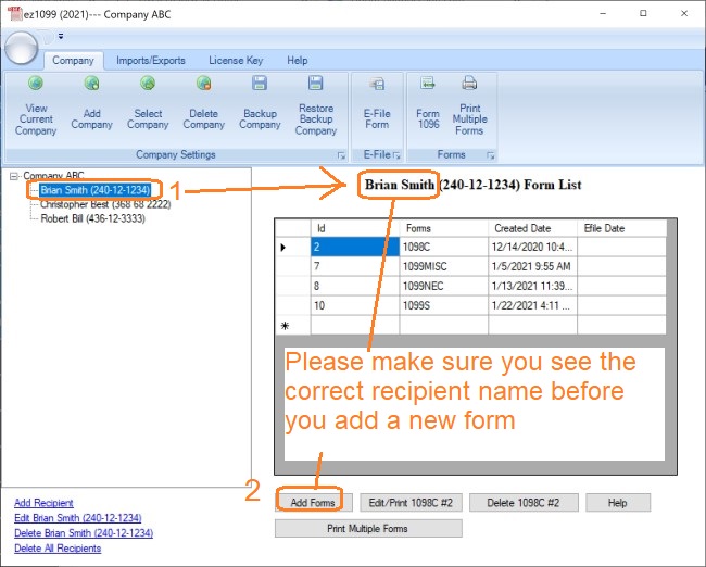 Start ez1099 software, select the recipient and click the Add Form button