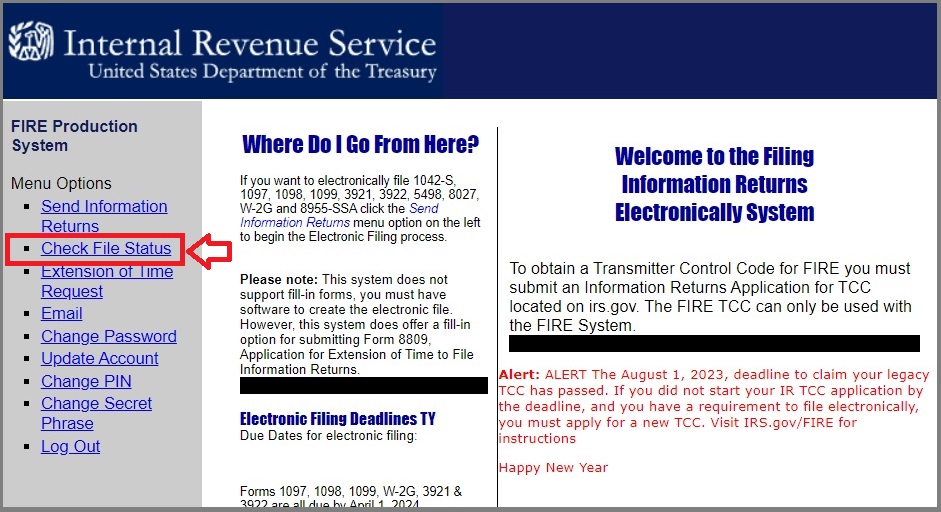 days or if you receive an email indicating the file is bad, log back into the IRS FIRE System and select "Check File Status".