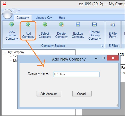 You can start ez1099 software, click the top menu "Company", then click the sub menu "Add company" to add a new account.