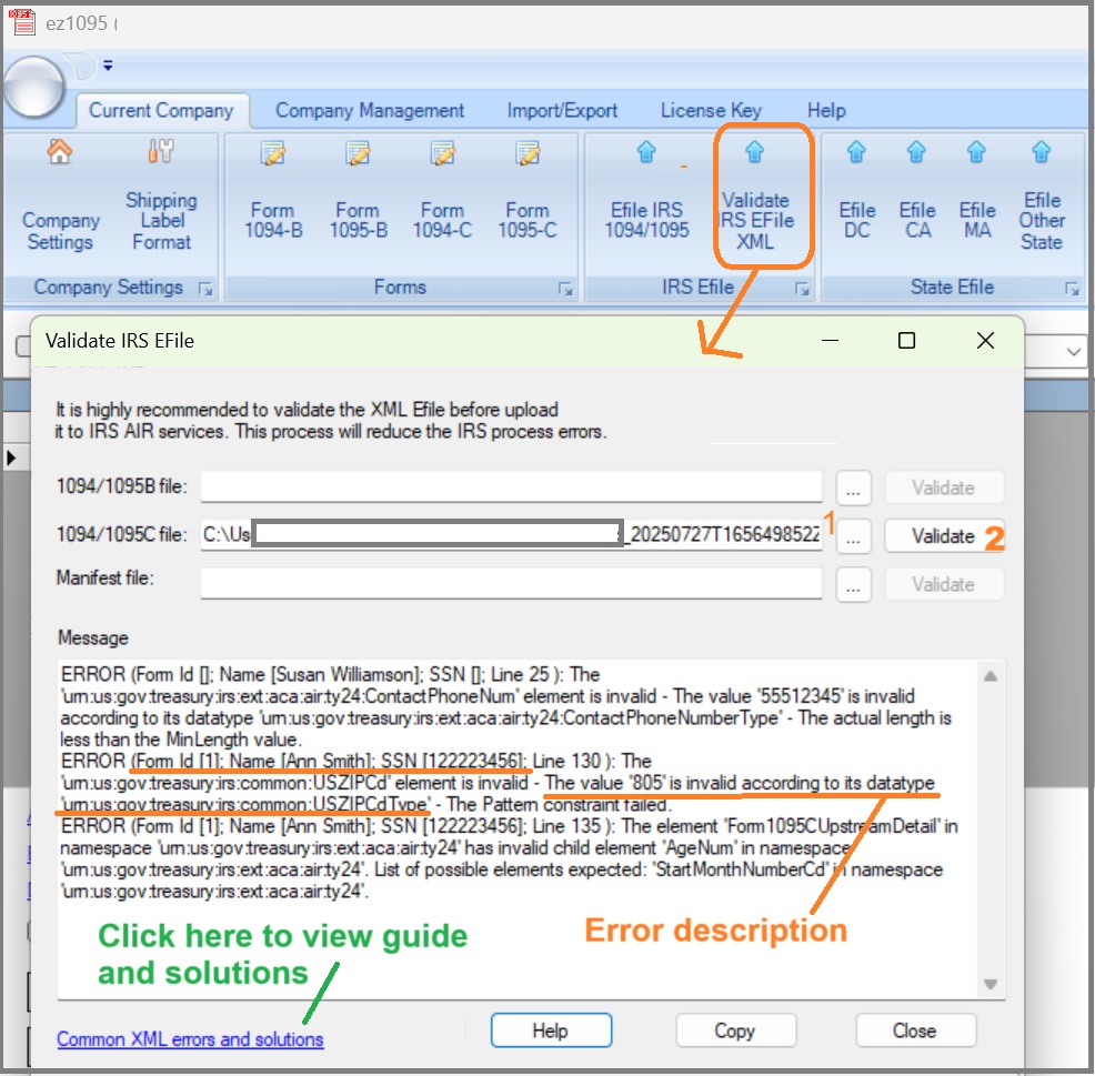 ERROR (Form Id []; Name [Susan Williamson]; SSN []; Line 25 ): The 'urn:us:gov:treasury:irs:ext:aca:air:ty24:ContactPhoneNum' element is invalid - The value '55512345' is invalid according to its datatype 'urn:us:gov:treasury:irs:ext:aca:air:ty24:ContactPhoneNumberType' - The actual length is less than the MinLength value.