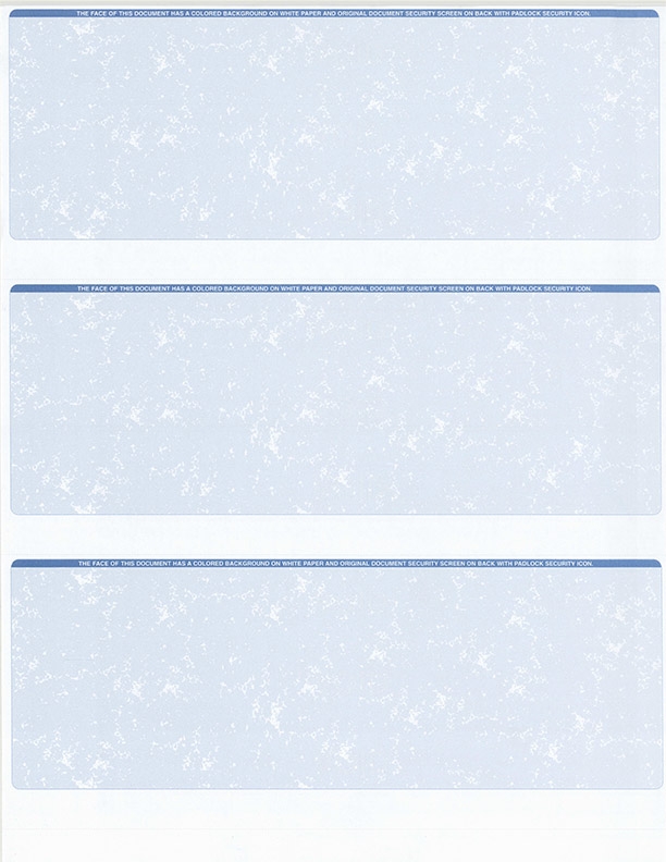 | 3-per-page Format Business Blank Check Stock Sheet size: 8-1/2" x 11"; Perforated Paper at 3-1/2", 7" to the top; Color:Blue; Form 3000 Business Standard