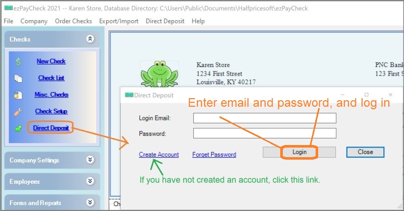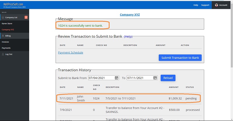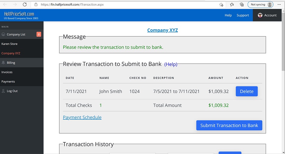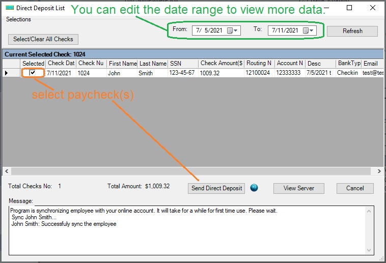 2. Select paychecks from list and click "Send Direct Deposit" button