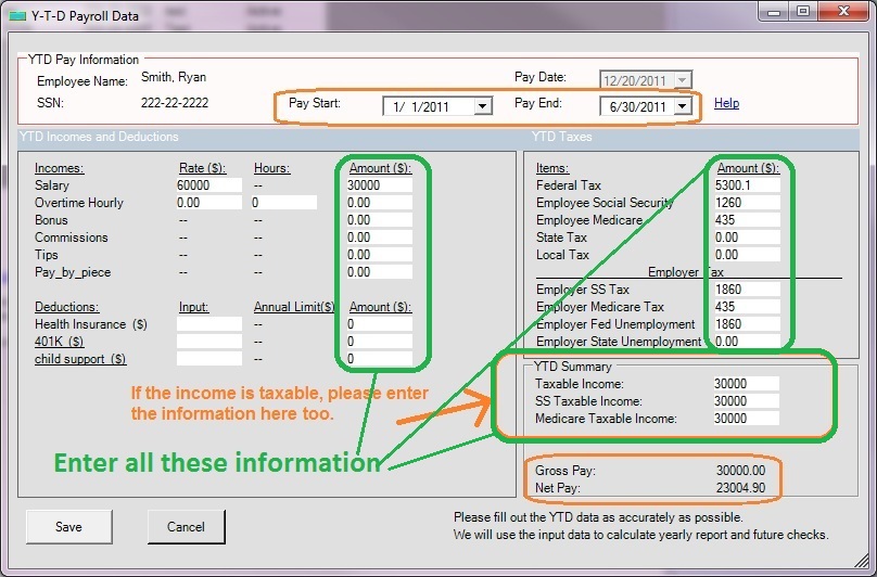 2.5 Select ONE Employee from list, and manually enter the YTD data for the entire company for the whole year. For example: If you need to print report for Year 20XX, the pay date should be 12/31/20XX, the Pay start date should 1/1/201X, and pay ending date should be 12/31/20XX.