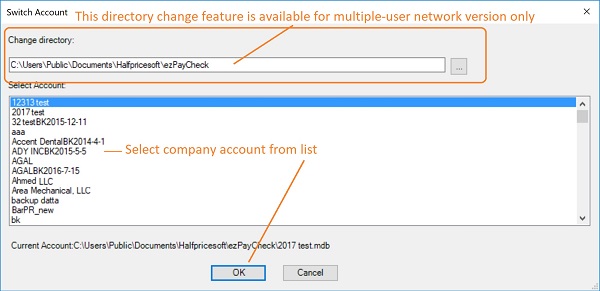 1. Start ezPaycheck, you can switch your current account by clicking the top menu "Company->Select Company". You can always find the current database file name and path from ezPaycheck top menu bar.