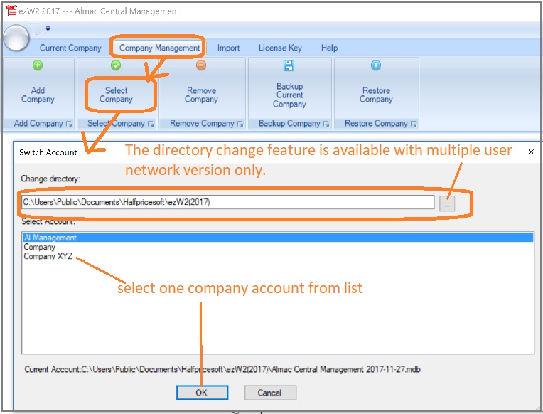 Start ezW2, click the top menu "Company Management->Select Company" to switch the current account.